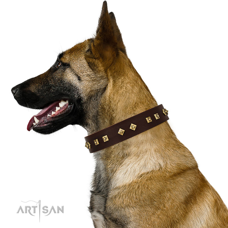 Do you adore elegant style? Allow your darling dog take joy in wearing such collars on! Purchase this incredible leather dog collar with embellishments from FDT Artisan. This gear is crafted for those who just is fond of stylish accessories. In this amazing collar, your four-legged friend will have more severe, but handsome look. Your attractive Belgian Malinois will get the finest treatment when wearing this gear. Genuine leather is gentle and absolutely eco-friendly.