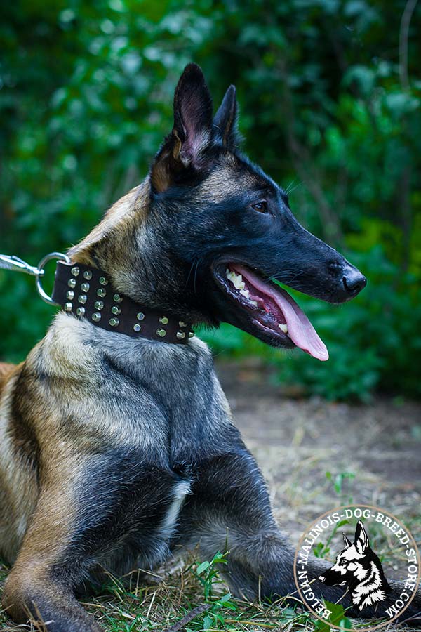 Belgian Malinois brown leather collar with non-corrosive cones for stylish walks
